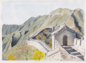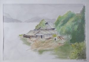 Dette motiv fra øen helt yderst i Halong Bay er et af de nyere, hvor jeg har brugt vandfast tusch til at tegne motivet op med og bagefter har malet det – ikke for massivt, men med akvarellens mulighed for lethed og transparens.