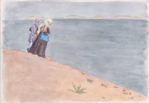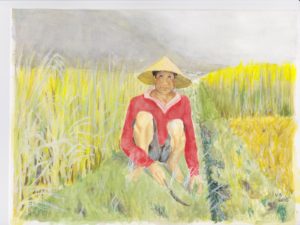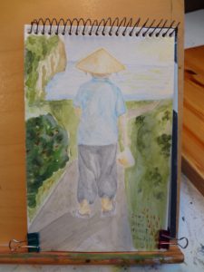 Den lille vietnameser med keglehat, klipklappere og plasticpose i hånden lavede jeg bagefter endnu en lille akvarel af – og gav ham et fantasilandskab at gå tur i. Det var hyggelig træning med vand, farver og pensler. Mit næste Vietnam-billede er fra Mai Chau. Vi boede i en pælehytte midt i rismarkerne, og jeg gik en stille aftentur ud mellem markerne, hvor en vietnamesisk bonde var ude med sin segl og høste. Jeg fik lov at tage et billede af ham, hvor han lyser op i sin røde t-shirt midt i den gulgrønne afgrøde og med tågede bjerge i baggrunden. Han var mit første forsøg på at male et menneskes ansigt – det var svært, og det er det stadig.