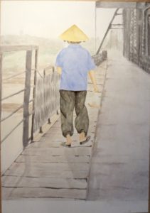 Vietnam var et af de første steder, jeg forsøgte mig med at male fra. Det blev et motiv fra Hanoi, fra Long Bien-broen. Denne akvarel er i A3-format. Jeg var meget længe om at male den – jeg var meget famlende dengang. Men resultatet blev tilfredsstillende.