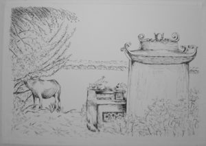 Den foreløbig sidste Vietnam-akvarel er næsten monokrom – og så ikke. Gitte fra Maleskolen har opfordret mig til at give den lidt mere gas med tuschtegningen, før jeg begynder med akvarellen. Hun synes, jeg tegner så fint, og det smigrer mig naturligvis. Så det har jeg gjort med motivet, hvor en okse begraver sit hoved i træet, som er fuldt af mad, og som står i udkanten af en begravelsesplads et stykke væk fra øens eneste lille landsby.