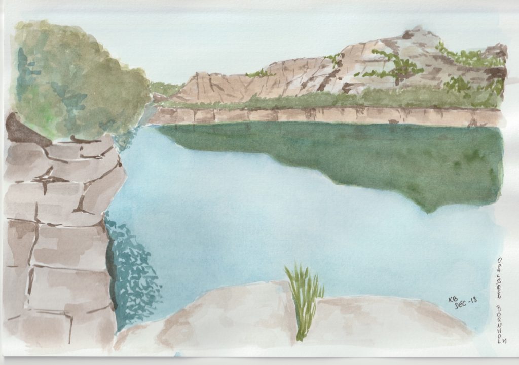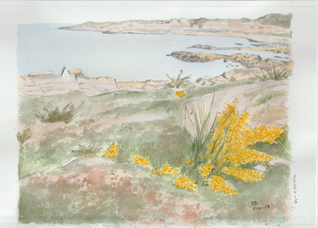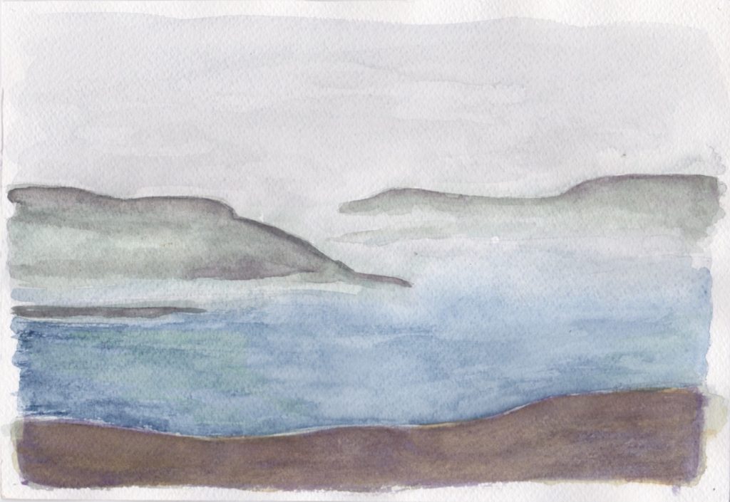 Den sidste dag før jul havde jeg en times tid til overs, efter at jeg havde gjort den akvarel færdig, som jeg havde i gang. Og så tog jeg lige et bornholmermotiv fra Opalsøen og lavede en hurtig version. En meget hurtig skitse af motivet, ingen tusch og så bare i gang med løs hånd.