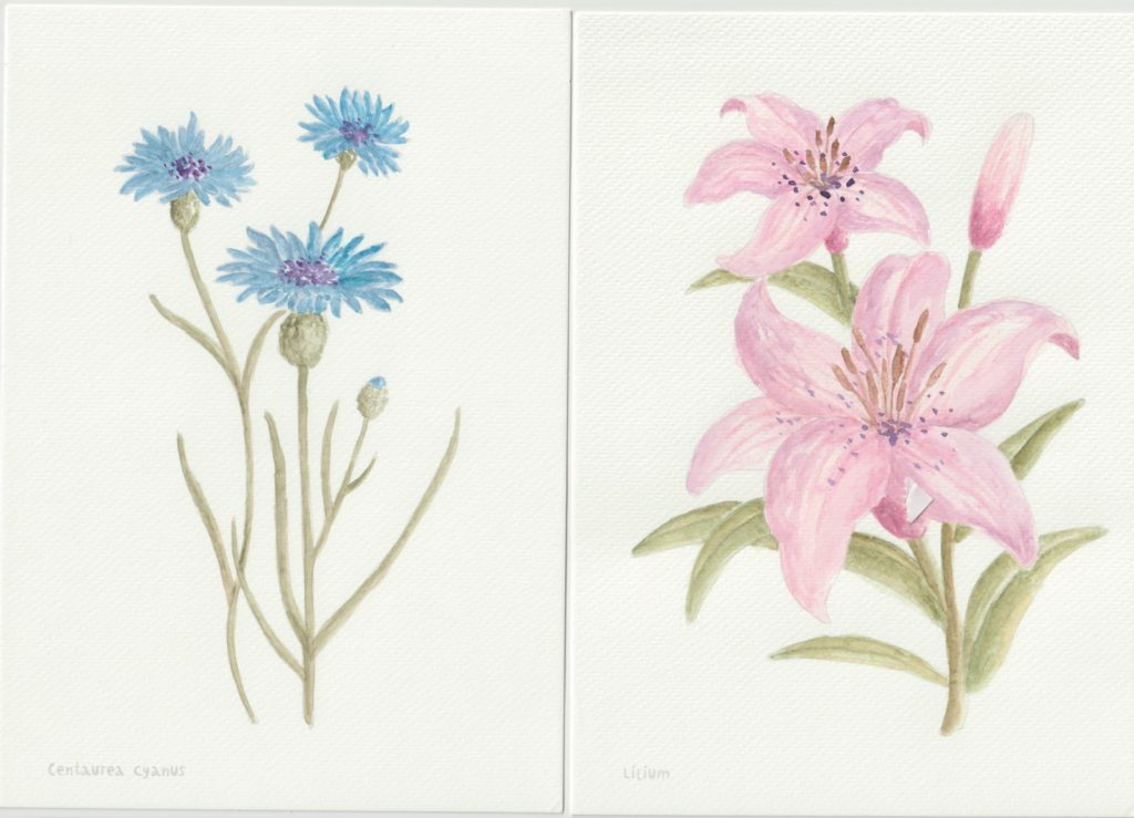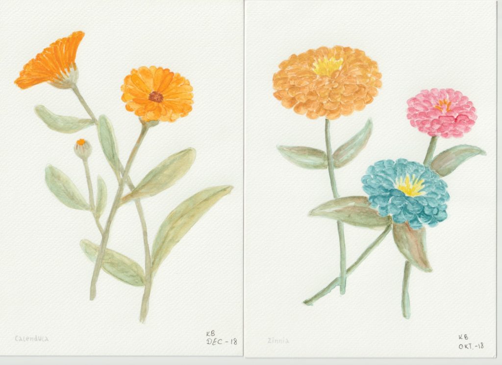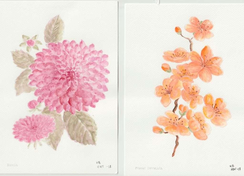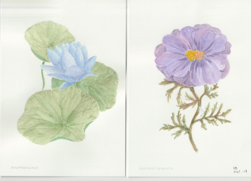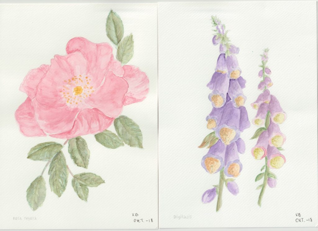 I min nærmeste Tiger-butik fandt jeg i efteråret en lille akvarelmalebog. Den var handy i A5-format, og den havde nogle let optegnede blomstermotiver – så let optegnede, at konturerne forsvinder, når akvarellen kommer på.