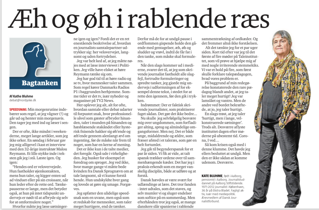 Det er ikke kun i de talte medier, det foregår. Også ude i virkeligheden. Jeg husker for eksempel et foredrag om sproget. Jeg ved ikke, hvor mange gange vi måtte bede kvinden fra Dansk Sprognævn om at tale langsomt, så vi kunne forstå hende. Hun undskyldte hver gang og lovede at gøre sig umage. Forgæves.