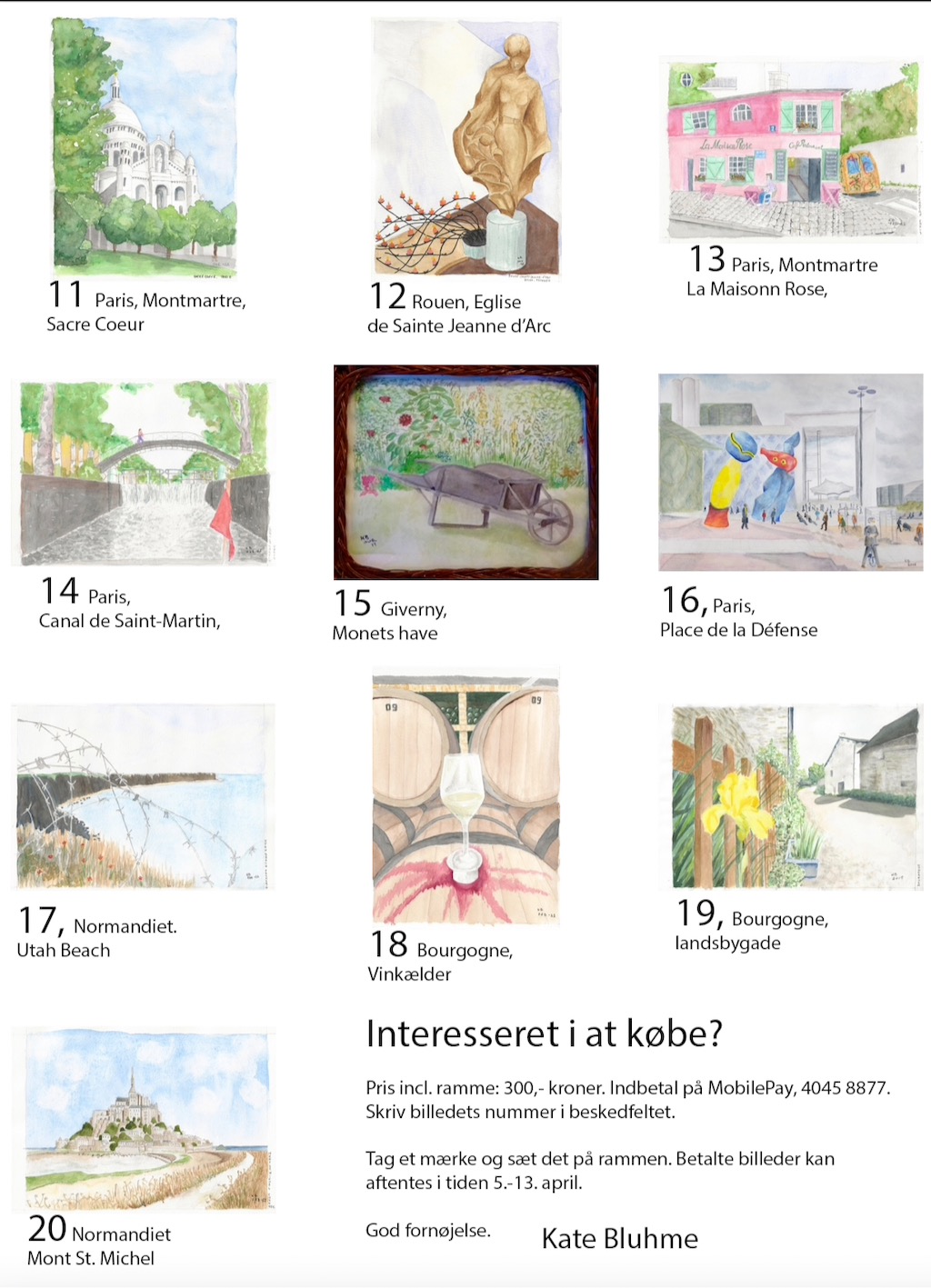 Der hænger 10 billeder med motiver fra Frankrig og 10 med motiver fra Aalborg. At det blev sådan, jeg valgte ud, er Majkens ide. Majken og Christian ejer cafeen, hvor der tidligere blev udstillet nogle fine, små akvareller, som en af deres unge ansatte havde malet. Dengang spurgte jeg for sjov, om jeg skulle være den næste udstiller? Og Majken slog til!