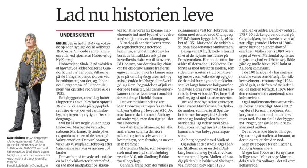 I dag er jeg gået i barndom med en klumme i Nor4jyske, som handler om Mariendals Mølle. Møllen er et markant islæt i Aalborgs bybillede, faktisk en slags velkomst til byen, når man kommer ad den gamle landevej fra syd med retning mod centrum og vejen over Limfjordsbroen videre op i Vendsyssel.